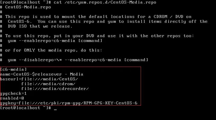 打开/etc/yum.repos.d/CentOS-Media.repo文件,我们可以发现该软件源的位置列表中有一项刚好指向/media/cdrom目录: