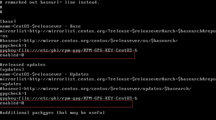 4. 打开/ect/yum.repos.d/CentOS-Base.repo文件,禁用其中定义的软件源(加上enabled=0):