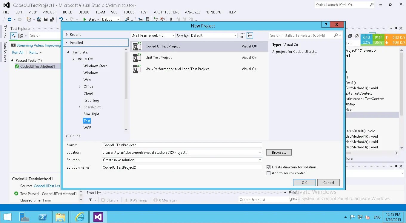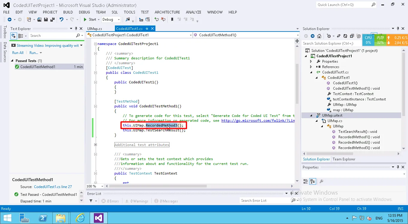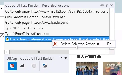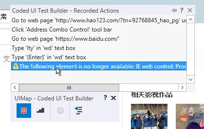 今天首次按照网上的步骤进行Coded UI测试,终于测试通过了,我这次进行的自动化测试是:打开浏览器,输入www.baidu.com,然后输入lty,然后点击页面中第一条数据的左侧位置(为了能获取到TestResult方法中需要的值)。