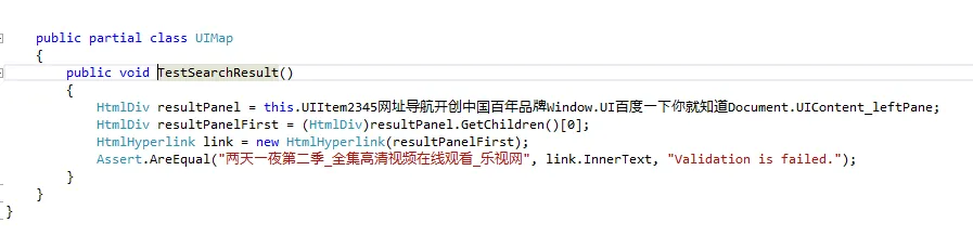 下面就是我改完后的TestSearchResult方法,他里面有个Assert是断言方法,用来判断第一条数据(link.InnerText)和我规定的"两台一夜……"是否一样,不一样返回“Validation is failed.”