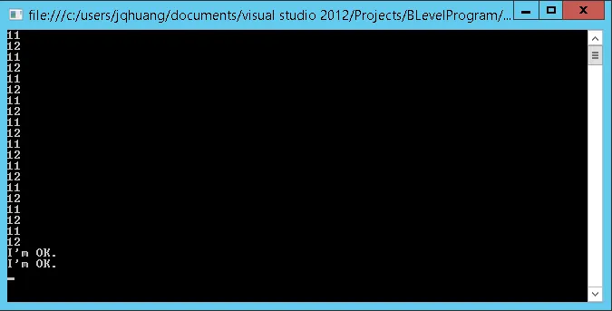 1 using System; 2 using System.Collections.Generic; 3 using System.Linq; 4 using System.Text; 5 using System.Threading.Tasks; 6 using System.Threading; 7 using System.Diagnostics; 8 using System.IO; 9 10 namespace BLevelProgram 11 { 12 class BLevelProgram 13 { 14 public BLevelProgram() 15 { 16 //Constructor 17 } 18 19 //静态标识符——记录写入次数. 20 static int i = 0; 21 static int o = 0; 22 //权利标识符——判断线程是否具有写入权利,默认为true,true为线程1的写入权利,false为线程2的写入权利. 23 static bool flag = true; 24 25 public static void Main() 26 { 27 //创建文件夹路径. 28 Directory.CreateDirectory(@"C:\tylan"); 29 Thread.Sleep(5000); 30 //创建输出文件并关闭. 31 File.Create(@"C:\tylan\File.txt").Close(); 32 //后台线程a,b轮流向文件交替写入数据. 33 Thread a = new Thread(kick1); 34 a.IsBackground = true; 35 Thread b = new Thread(kick2); 36 b.IsBackground = true; 37 a.Start(); 38 b.Start(); 39 //让主线程等待后台线程. 40 Thread.Sleep(1000000); 41 Console.ReadLine(); 42 } 43 44 //向文件中写入当前thread的ID. 45 public static void kick1() 46 { 47 for (int c = 1; c <= 12; c++) 48 { 49 //判断线程是否具有写入权利. 50 while (flag == false) 51 { 52 //没有权利的时候就继续等待. 53 Thread.Sleep(1000); 54 } 55 //小于10次写入则继续写入. 56 if (i < 10) 57 { 58 //输出采取追加模式. 59 StreamWriter file = new StreamWriter(@"C:\tylan\File.txt", true); 60 //写一行到文件中. 61 file.WriteLine(Thread.CurrentThread.ManagedThreadId); 62 //控制台显示结果. 63 Console.WriteLine(Thread.CurrentThread.ManagedThreadId); 64 //关闭文件. 65 file.Close(); 66 //线程a写入次数加一. 67 i++; 68 //把写入权利交给线程b. 69 flag = false; 70 } 71 //等于10次就回调. 72 else 73 { 74 //执行线程回调函数. 75 ThreadCallBack(); 76 } 77 } 78 } 79 80 //向文件中写入当前thread的ID. 81 public static void kick2() 82 { 83 for (int c = 1; c <= 12; c++) 84 { 85 //判断线程是否具有写入权利 86 while (flag == true) 87 { 88 //没有权利的时候就继续等待. 89 Thread.Sleep(1000); 90 } 91 //小于10次写入则继续写入. 92 if (o < 10) 93 { 94 //输出采取追加模式. 95 StreamWriter file = new StreamWriter(@"C:\tylan\File.txt", true); 96 //写一行到文件中. 97 file.WriteLine(Thread.CurrentThread.ManagedThreadId); 98 //控制台显示结果. 99 Console.WriteLine(Thread.CurrentThread.ManagedThreadId); 100 //关闭文件. 101 file.Close(); 102 //线程b的写入次数加一. 103 o++; 104 //把写入权利交给线程a. 105 flag = true; 106 } 107 //等于10次就回调. 108 else 109 { 110 //执行线程回调函数. 111 ThreadCallBack(); 112 } 113 } 114 } 115 116 //线程回调函数 117 public static void ThreadCallBack() 118 { 119 //在函数中输出"I'm OK.". 120 Console.WriteLine("I'm OK."); 121 } 122 } 123 }