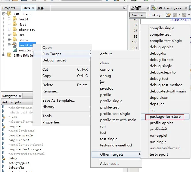 文件页里找到build.xml文件,打开在</project>前 加入以下代码保存之