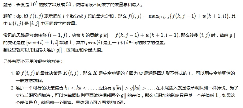 对于每一个位置,找到前面最后一个与它数字相同的的位置,把这之间线段树的值都加上1,然后dp[i][j]的值就是j-1到i-1的最大值。