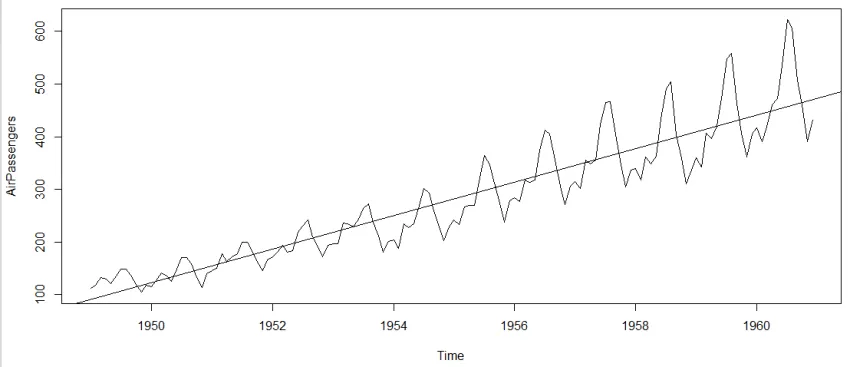 1 #The number of passengers are distributed across the spectrum 2 > plot(AirPassengers) 3 #绘制出时间序列 4 >abline(reg=lm(AirPassengers~time(AirPassengers))) 5 # 拟合一条直线