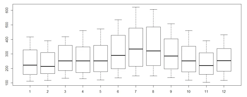 1 > cycle(AirPassengers) 2 Jan Feb Mar Apr May Jun Jul Aug Sep Oct Nov Dec 3 1949 1 2 3 4 5 6 7 8 9 10 11 12 4 1950 1 2 3 4 5 6 7 8 9 10 11 12 5 1951 1 2 3 4 5 6 7 8 9 10 11 12 6 1952 1 2 3 4 5 6 7 8 9 10 11 12 7 1953 1 2 3 4 5 6 7 8 9 10 11 12 8 1954 1 2 3 4 5 6 7 8 9 10 11 12 9 1955 1 2 3 4 5 6 7 8 9 10 11 12 10 1956 1 2 3 4 5 6 7 8 9 10 11 12 11 1957 1 2 3 4 5 6 7 8 9 10 11 12 12 1958 1 2 3 4 5 6 7 8 9 10 11 12 13 1959 1 2 3 4 5 6 7 8 9 10 11 12 14 1960 1 2 3 4 5 6 7 8 9 10 11 12 15 #打印每年的周期 16 > plot(aggregate(AirPassengers,FUN=mean)) 17 #绘制 18 > boxplot(AirPassengers~cycle(AirPassengers)) 19 #绘制盒图
