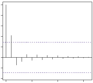 上图蓝线显示值与0具有显著的差异。很显然上面PACF图显示截尾于第二个滞后,这意味这是一个AR(2)过程。