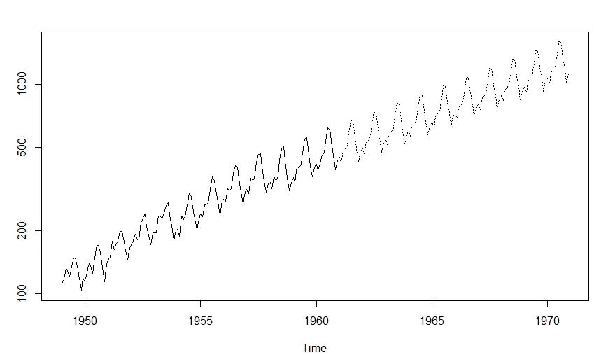 1 > fit <- arima(log(AirPassengers), c(0, 1, 1),seasonal = list(order = c(0, 1, 1), period = 12)) 2 > pred <- predict(fit, n.ahead = 10*12) 3 ts.plot(AirPassengers,2.718^pred$pred, log = "y", lty = c(1,3))