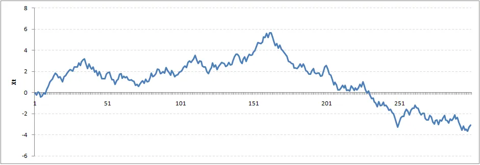 这是时间序列最基本的概念。你可能很了解这个概念。但是,很多工业界的人仍然将随机游走看做一个平稳序列。在这一节中,我会使用一些数学工具,帮助理解这个概念。我们先看一个例子
