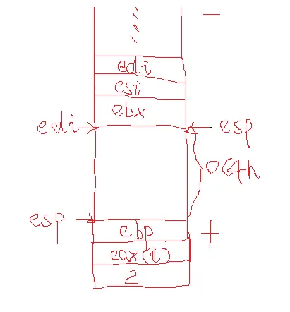 1 int _cdecl Test (int i, int j) 2 { 3 return j + i ++; 4 } 5 6 int _cdecl Test (int i, int j) 7 { 8 01311690 push ebp 9 01311691 mov ebp,esp 10 01311693 sub esp,0C4h 11 01311699 push ebx 12 0131169A push esi 13 0131169B push edi 14 0131169C lea edi,[ebp-0C4h] 15 013116A2 mov ecx,31h ;31h * 4 = 0C4h 16 013116A7 mov eax,0CCCCCCCCh 17 013116AC rep stos dword ptr es:[edi] ;和上面无参的类型一样 18 return j + i ++; 19 013116AE mov eax,dword ptr [j] 20 013116B1 add eax,dword ptr [i] 21 013116B4 mov dword ptr [ebp-0C4h],eax 22 013116BA mov ecx,dword ptr [i] 23 013116BD add ecx,1 24 013116C0 mov dword ptr [i],ecx 25 013116C3 mov eax,dword ptr [ebp-0C4h] 26 } 27 013116C9 pop edi 28 013116CA pop esi 29 013116CB pop ebx 30 013116CC mov esp,ebp 31 013116CE pop ebp 32 013116CF ret 33 34 00D21D88 push 2 ;在调用函数之前先将参数从右往左压入堆栈 35 00D21D8A mov eax,dword ptr [i] 36 00D21D8D push eax 37 00D21D8E call Test (0D211F4h) ;函数调用 38 00D21D93 add esp,8 ;平衡堆栈 39 00D21D96 mov dword ptr [i],eax 40