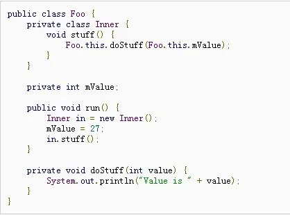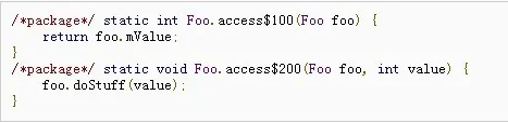 需要注意的关键是:我们定义的一个私有内部类(Foo$Inner),直接访问外部类中的一个私有方法和私有变量。这是合法的,代码也会打印出预期的“Value is 27”。