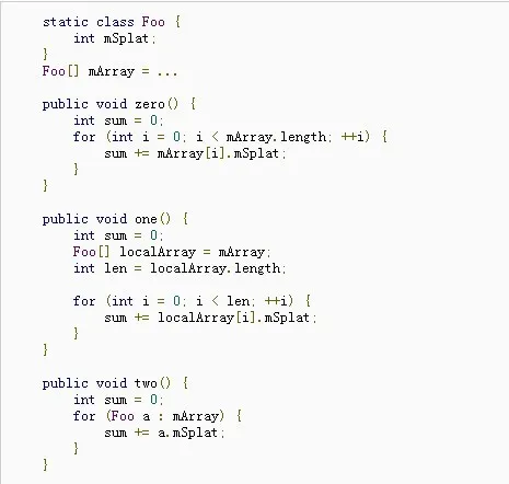 Two()是在无JIT的设备上运行最快的,对于有JIT的设备则和one()不分上下。他采用了JDK1.5中的改进for循环语法。