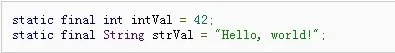 类不再需要<clinit>方法,因为常量通过静态字段初始化器进入dex文件中。引用intVal的代码,将直接调用整形值42;而访问strVal,也会采用相对开销较小的“字符串常量”(原文:“sring constant”)指令替代字段查找。(这种优化仅仅是针对基本数据类型和String类型常量的,而非任意的引用类型。但尽可能的将常量声明为static final是一种好的做法。
