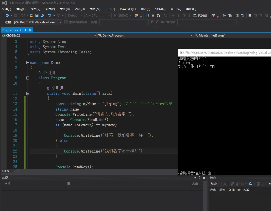 Console.WriteLine("好巧,我们名字一样!");