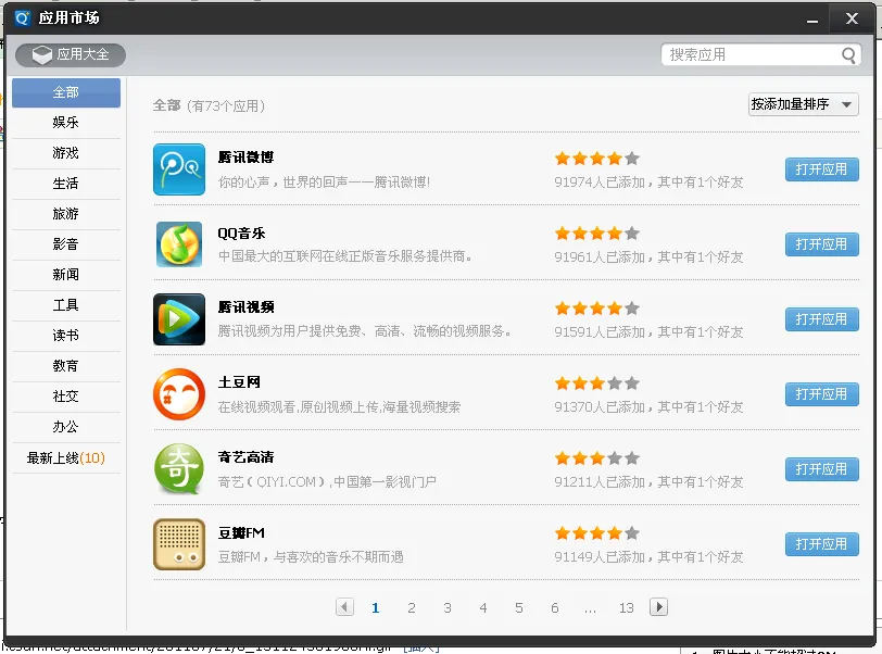 打开添加应用。就是一个应用市场的主界面,上面列出了很多的应用,左侧是个用于分类过滤树形菜单,右上角是搜索和排序的功能。中间是应用程序列表,右下角是个分页的功能。对于这个界面,我想做个半年数据库开发的童鞋来说都不存在难度吧。简单的说就是一个列表的展示,分页,排序、查询功能。