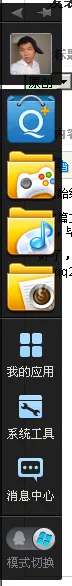 我的头像下面分别有:添加应用、游戏、影音、生活、我的应用、系统工具、消息中心、模式切换几个菜单按钮。