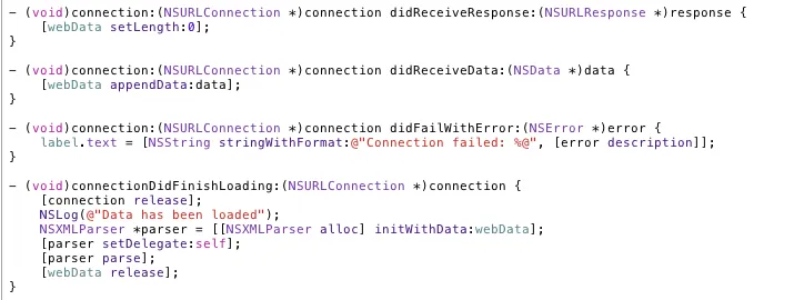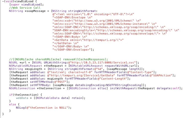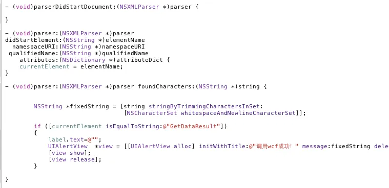 与donet调用wcf服务不同,这里使用NSURLConnection去获取WCF服务端的数据,代码如下: