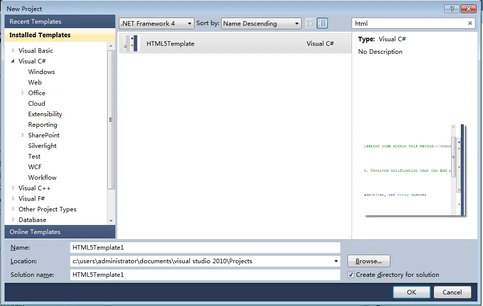 本文在简单不过了,就是为你的Visual Studio2010创建一个项目模板,一个HTML5的项目模板。谁叫HTML5时代来了,Visual Studio 2010又没提供此模板呢?那我们就动手做一个吧!