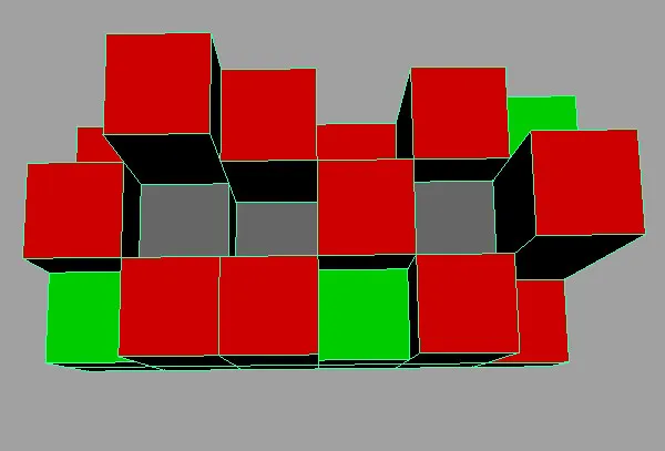 向周围BFS搜索的条件是不能越界,且周围格子未被访问,那么可以看出上面的第一个和最后一个绿格子无法进行进一步搜索,只有第一行中间那个绿格子可以搜索,其周围有一个灰格子未被访问过,将其加入优先队列queue中,然后标记为红色,如下图所示: