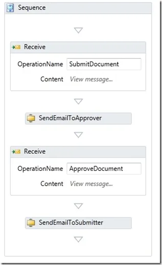 假设你对Workflow Foundation, Activities, Workflow Services, 和Messaging Activities有一些基本理解,我不打算详细解释这些。 它基本上模拟这样一个服务,首先接受一个文件提交的信息。请发送电子邮件至审核人员(使用自定义活动),接受第二个消息是文件审批,然后发送电子邮件提交 者(使用自定义活动)。