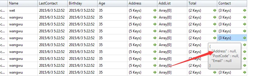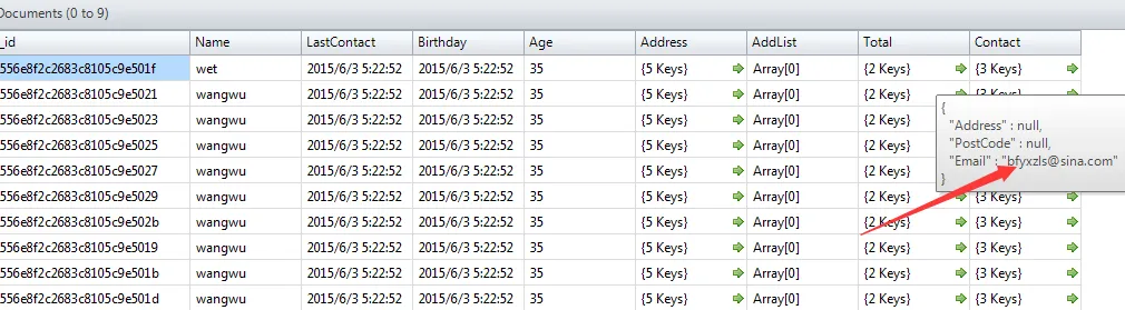 public class Person { public Person() { Contact = new Test.Contact(); AddList = new List<Test.Address>(); Id = MongoDB.Bson.ObjectId.GenerateNewId().ToString(); } [BsonId] [BsonRepresentation(BsonType.ObjectId)] public string Id { get; set; } public string Name { get; set; } public DateTime LastContact { get; set; } public DateTime Birthday { get; set; } public int Age { get; set; } public Address Address { get; set; } public List<Address> AddList { get; set; } /// <summary> /// 值对象 /// </summary> public Contact Contact { get; set; } }