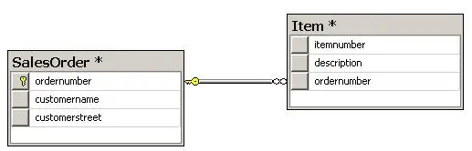 在这个例子中,我们使用的是1:N关系的两个简单的数据表。一个表(SalesOrder)包含客户信息的订单,例外一张表(Items)中包含的具体的项。一个订单可以有多个项,一个项往往只属于一个订单。