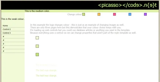 在central.aspx,我们判断是否有一个名字为"colorme"的cookie。如果没有,我们生成一个1至5之间的一个随机数和定义适当四个变量根据这个随机数。(这些变量将会用来设置logo , 弱色,中等色彩,和强烈的色彩)。 如果有一个名字为"'colorme'"的cookie ,我们的四个变量设置到适当的logo和颜色。一旦四个变量的设置,不同的CSS样式被分配给相应的值。