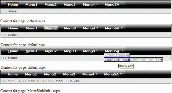 设置 staticdisplaylevels ="2" 和orientation="Horizontal"来横向的显示menu控件。我们可以使用内联样式表或放置在一个外部文件中的CSS样式。在本例中,CSS样式位于style.css文件。