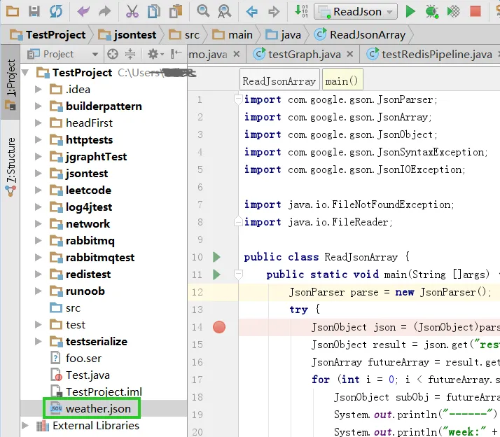 import com.google.gson.JsonObject; import com.google.gson.JsonParser; import com.google.gson.JsonSyntaxException; import com.google.gson.JsonIOException; import java.io.FileNotFoundException; import java.io.FileReader; public class ReadJson { public static void main(String []args) { JsonParser parse = new JsonParser(); try { JsonObject json = (JsonObject) parse.parse(new FileReader("weather.json")); System.out.println("resultcode:" + json.get("resultcodeu").getAsInt()); System.out.println("reason:" + json.get("reason").getAsString()); JsonObject result = json.get("result").getAsJsonObject(); JsonObject today = result.get("today").getAsJsonObject(); System.out.println("weak:" + today.get("week").getAsString()); System.out.println("weather:" + today.get("weather").getAsString()); } catch (JsonIOException e) { e.printStackTrace(); } catch (NullPointerException e) { e.printStackTrace(); } catch (JsonSyntaxException e){ e.printStackTrace(); } catch (FileNotFoundException e) { e.printStackTrace(); } } }
