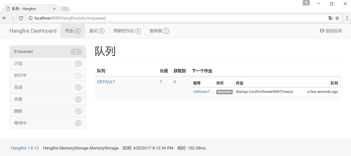 上面配置代码一分钟执行一次,Hangfire 支持 UI 界面展示,地址:http://localhost:8089/hangfire