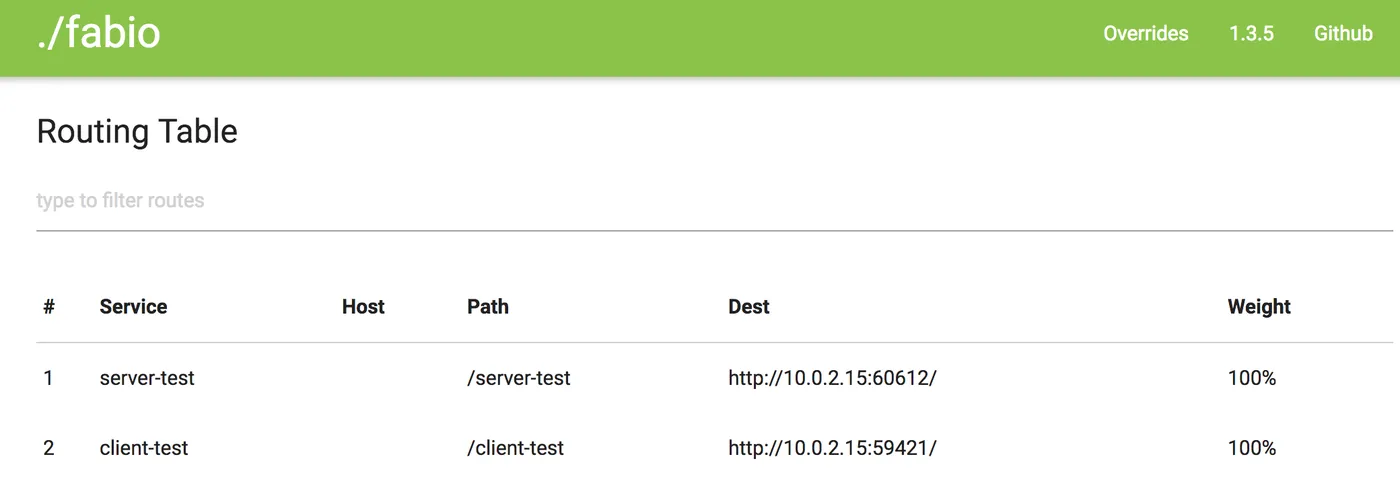 - http://10.9.10.173:9998:Fabio 后台 UI 界面,可以看到服务地址和权重,也可以增加路由规则。