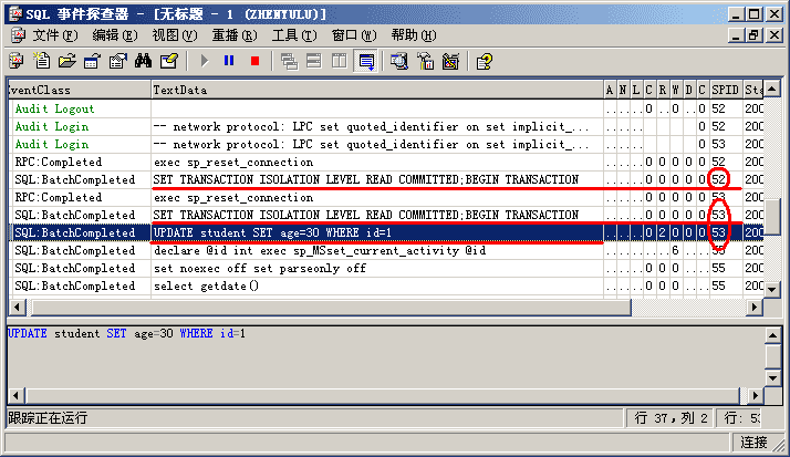 第三步,为了进一步查明原因真相,我们切换到事件探察器窗口,看看这两个进程都是干什么的。如图 2-9所示,事件探察器显示了这两个进程的详细信息。从图中我们可以看出,52号进程对应我们的事务1,53号进程对应我们的事务2。事务2执行了UPDATE命令,但尚未提交,此时事务1去读尚未提交的数据便被阻塞住。从图中我们可以看出52号进程是被阻塞者。