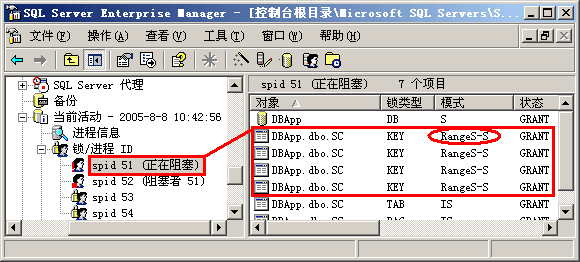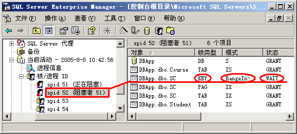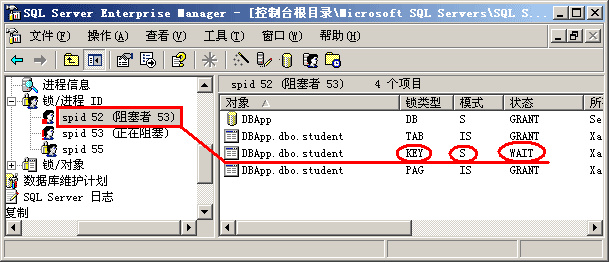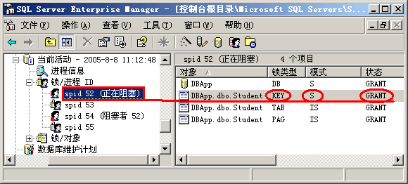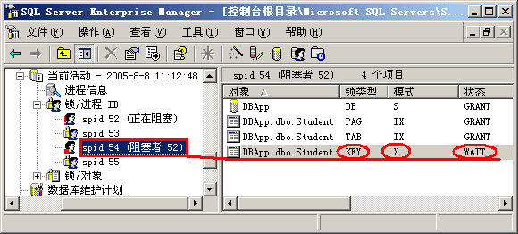 第四步,了解了上面发生的事情后,我们现在可以深入讨论一下共享锁和排它锁的使用情况了。重新回到企业管理器界面,让我们查看一下两个进程各占用了什么资源。从图 2-10中我们可以看出,53号进程(事务2)在执行更新命令前对相应的键加上了排它锁(X锁),按照前文提到的1级封锁协议,该排它锁只有在事务2提交或回滚后才释放。现在52号进程(事务1)要去读同一行数据,按照2级封锁协议,它要首先对该行加共享锁,然而 该行数据已经被事务2加上了排它锁,因此事务1只能处于等待状态,等待排它锁被释放。因此我们就看到了前面的"阻塞"问题。