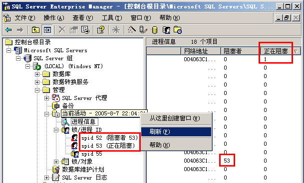 第二步,运行改动后的程序,程序执行到一半就暂停了。此时迅速切换到企业管理器界面,右击"管理"下面的"当前活动",选择"刷新"(整个过程应在大约15秒内完成即可,如图 2-8所示),我们便得到了数据库当前进程的一个快照。