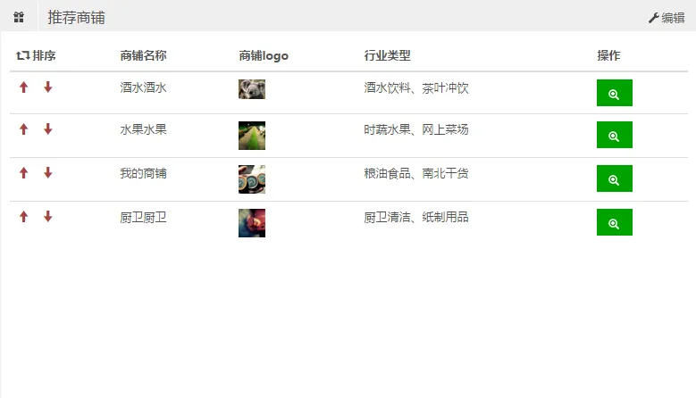 <tr id="{sh:$vo.id}"> <td> <span onclick="up(this);" class="glyphicon glyphicon-arrow-up text-danger up" style="cursor: pointer;" title="上移" aria-hidden="true"></span> <span onclick="down(this);" class="glyphicon glyphicon-arrow-down text-danger down" style="cursor: pointer;" title="下移" aria-hidden="true"></span> </td> <td> <span title="{sh:$vo.user_id}">{sh:$vo.store_name}</span> </td> <td class="center"><a href="{sh:$vo.logo}" target="_blank"><img src="{sh:$vo.logo}" width='30px;'></td> <td class="center">{sh:$vo.category_name}</td> <td class="center edit"> <a val="{sh:$vo.store_id}" onclick="view(this);" class="view btn btn-success" href="javascript:void(0);" title="查看"> <i class="halflings-icon white zoom-in"></i> </a> </td> </tr>