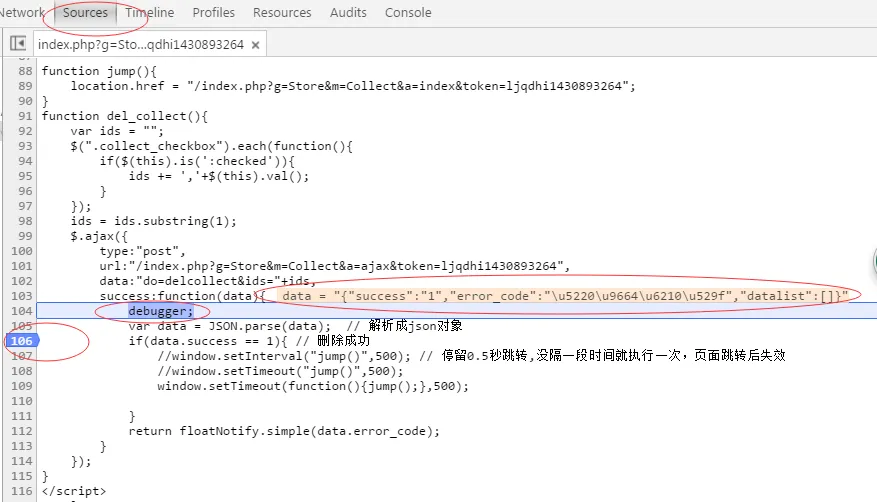 $.ajax({ type:"post", url:"{sh::U('Collect/ajax',array('token'=>$token))}", data:"do=delcollect&ids="+ids, success:function(data){ debugger; var data = JSON.parse(data); // 解析成json对象 if(data.success == 1){ // 删除成功 //window.setInterval("jump()",500); // 停留0.5秒跳转,没隔一段时间就执行一次,页面跳转后失效 //window.setTimeout("jump()",500); window.setTimeout(function(){jump();},500); } return floatNotify.simple(data.error_code); } });