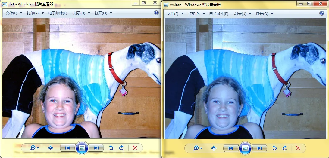 色彩平衡算法。下图是算法的演示效果(左边为处理后的图像,右边为处理前的图像)。