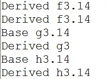 #include <iostream> using namespace std; class Base { public: virtual void f(float x) {cout << "Base f" << x << endl;} void g(float x) {cout << "Base g" << x << endl;} void h(float x) {cout << "Base h" << x << endl;} }; class Derived : public Base { public: void f(float x) {cout << "Derived f" << x << endl;} //同参 + virtual —— 继承 void g(int x) {cout << "Derived g" << x << endl;} //不同惨 ——隐藏 void h(float x) {cout << "Derived h" << x << endl;} //同参 + 无virtual ——隐藏 }; int main() { Derived d; Base *pb = &d; Derived *pd = &d; pb->f(3.14f); pd->f(3.14f); pb->g(3.14f); pd->g(3.14f); pb->h(3.14f); pd->h(3.14f); }