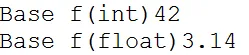 #include <iostream> using namespace std; class Base { public: void f(int x) {cout << "Base f(int)" << x << endl;} void f(float x) {cout << "Base f(float)" << x << endl;} }; int main() { Base b; b.f(42); b.f(3.14f); }