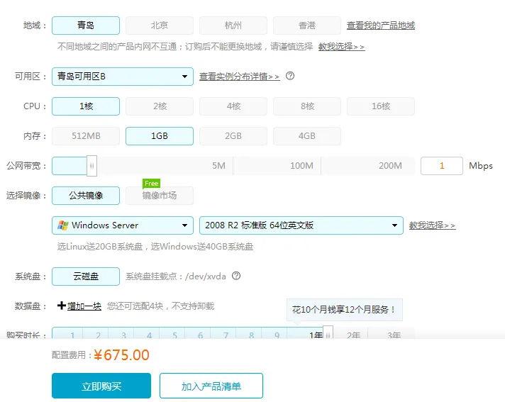 3、测试服务器并选择配置。因为自己要做的是.NET程序,所以Windows操作系统是不二的选择。为了节省开支选择的最低配的服务器,这其中支持Windows的最低内存是1G。