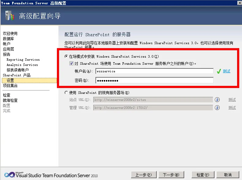 继续下一步,到这里进行添加Windows SharePoint Services的帐号,同样还是之前准备好的