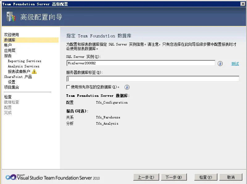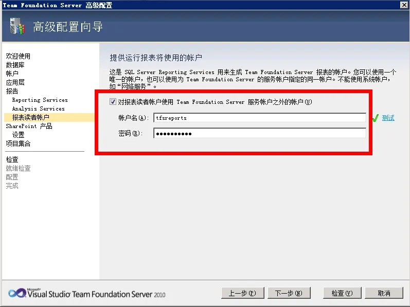 继续下一步下一步,到报表读者帐户,填写之前准备好的账户tfsreports
