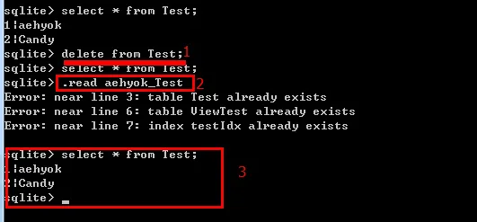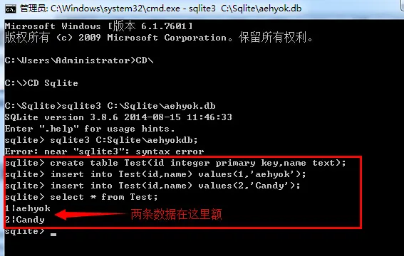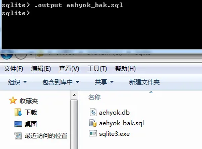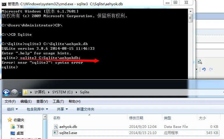 5、再输入一次 sqlite3 C:\Sqlite\aehyok.db;虽然命令报错了,但是数据库还是生成了,不知道为什么,现在还可以用,那就继续吧