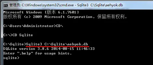 4、现在开始创建数据库:调用C:\Sqlite下的sqlite3.exe文件,输入命令为 sqlite3 C:\Sqlite\aehyok.db