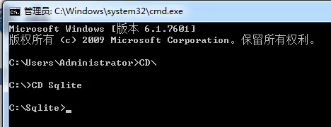 再输入 CD Sqlite,会跳转到C:\Sqlite文件夹下(如果你想去D盘,那么就输入D:就可以了)