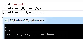 word='aehyok' print(word[0],word[5]) print(word[-1],word[-5])