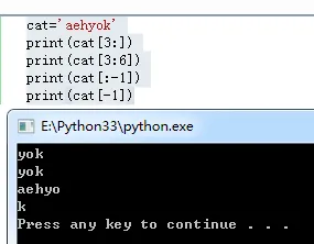 cat='aehyok' print(cat[3:]) print(cat[3:6]) print(cat[:-1]) print(cat[-1])