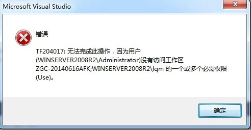 最近刚刚搭建好服务器,然后准备将VSS源代码迁移到TFS源代码管理服务器上面。在我本机先用的服务器帐号来上传初始化源代码数据库,然后我又用自己的帐号进行迁出代码的时候发生的异常。