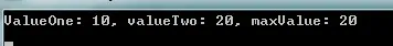 static void Main( string[] args ) { int valueOne = 10; int valueTwo = 20; int maxValue = valueOne > valueTwo ? valueOne : valueTwo; Console.WriteLine( "ValueOne: {0}, valueTwo: {1}, maxValue: {2}", valueOne, valueTwo, maxValue ); }
