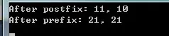 static void Main(string[] args) { int valueOne = 10; int valueTwo; valueTwo = valueOne++; Console.WriteLine("After postfix: {0}, {1}", valueOne, valueTwo); valueOne = 20; valueTwo = ++valueOne; Console.WriteLine("After prefix: {0}, {1}", valueOne, valueTwo); Console.ReadLine(); }