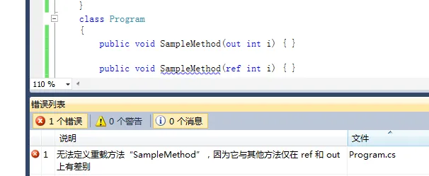 ref 和 out 关键字在运行时的处理方式不同,但在编译时的处理方式相同。因此,如果一个方法采用 ref 参数,而另一个方法采用 out 参数,则无法重载这两个方法。例如,从编译的角度来看,以下代码中的两个方法是完全相同的,因此将不会编译以下代码: